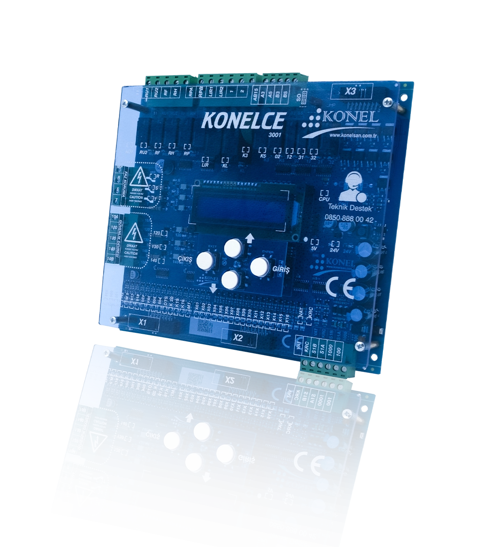 Genel Özellikler * 2 Satır 16 Karakter LCD ekran ve 4 tuş klavye * Kabin ile seri tesisat bağlantısı için * RS-485 seri haberleşme * Son 20 hatanın hafızada tutulması * Dahili faz sıralı motor koruma devresi * 2 otomatik kapı için dahili kontrol giriş ve çıkışları * Kısa devre korumalı dijital ve sinyal çıkışları * Göstergeler için menüden ayarlanabilir 7 Segment, Gray ve Binary kod çıkışları * Basit kumanda yukarı aşağı toplamalı çalışma * 16 durak çalışabilme